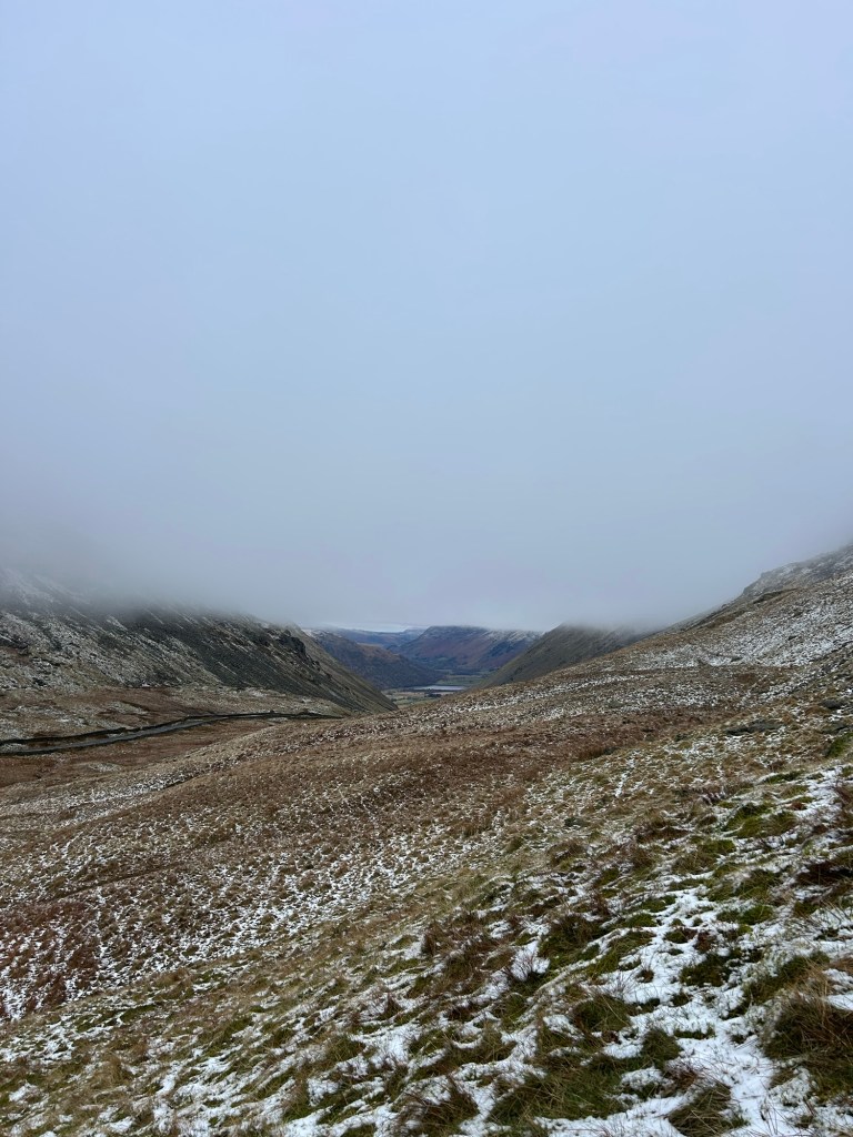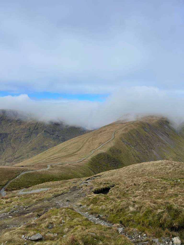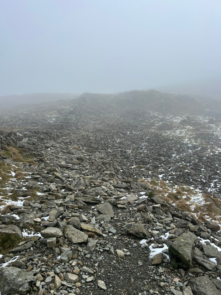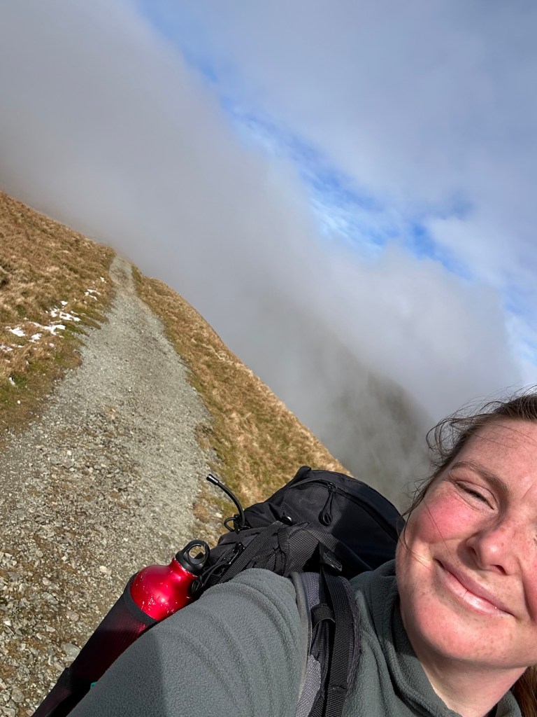 I headed into the Fells via St Raven‘s Edge to Stoney Cove Pike (763m). This leg was all in the cloud, minus a brief 2 minute window where the cloud cleared enough to give me a glimpse to the incredible views that would be waiting for me once I got out of the cloud.
